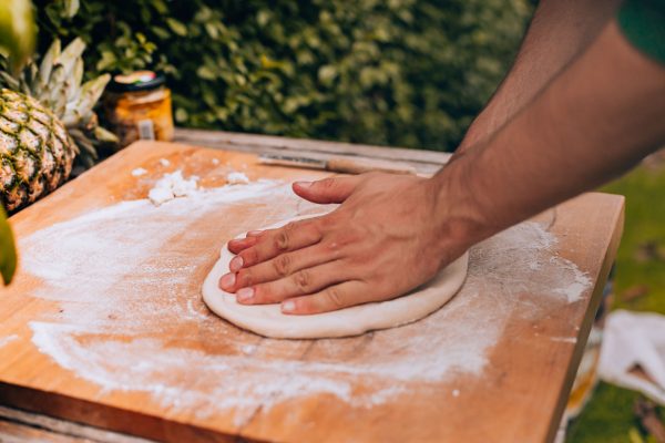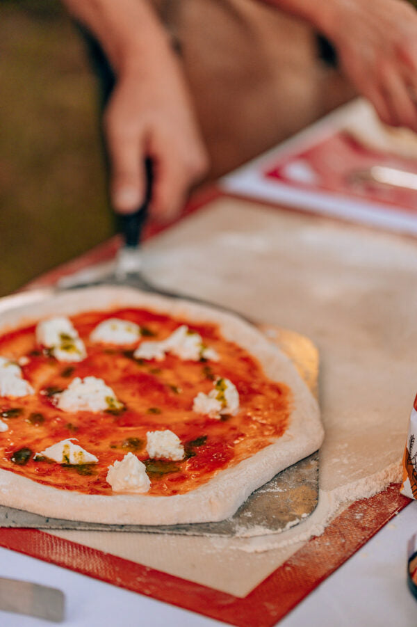 Semola helpt net zoals bloem te verhinderen dat je deeg aan de pizzaschep blijft plakken, maar verbrandt minder vlug. Het geeft daarnaast een extra krokantje aan je pizzakorst. Is je deegbol mooi bedekt met de bloem of semola, dan kun je deze vervolgens op je werkvlak leggen.