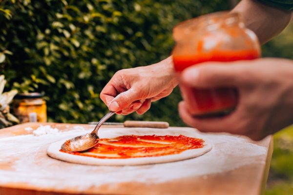 8. Vanaf je de pizza belegt met saus en andere toppings, vergroot de kans dat door de vochtigheid het deeg aan de pizzaschep gaat plakken. Snel werken is dus de boodschap!