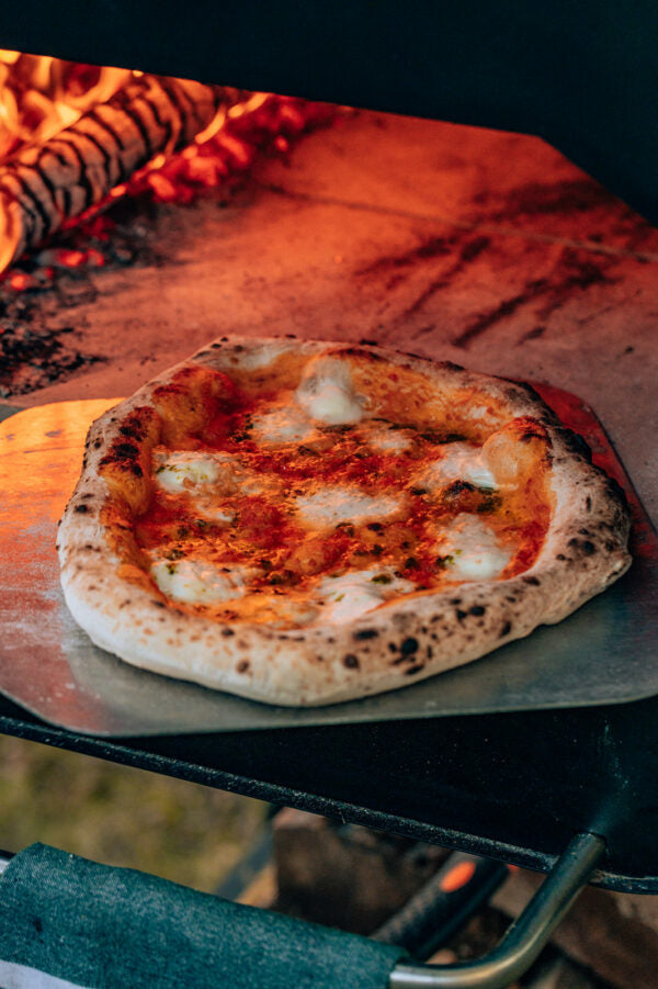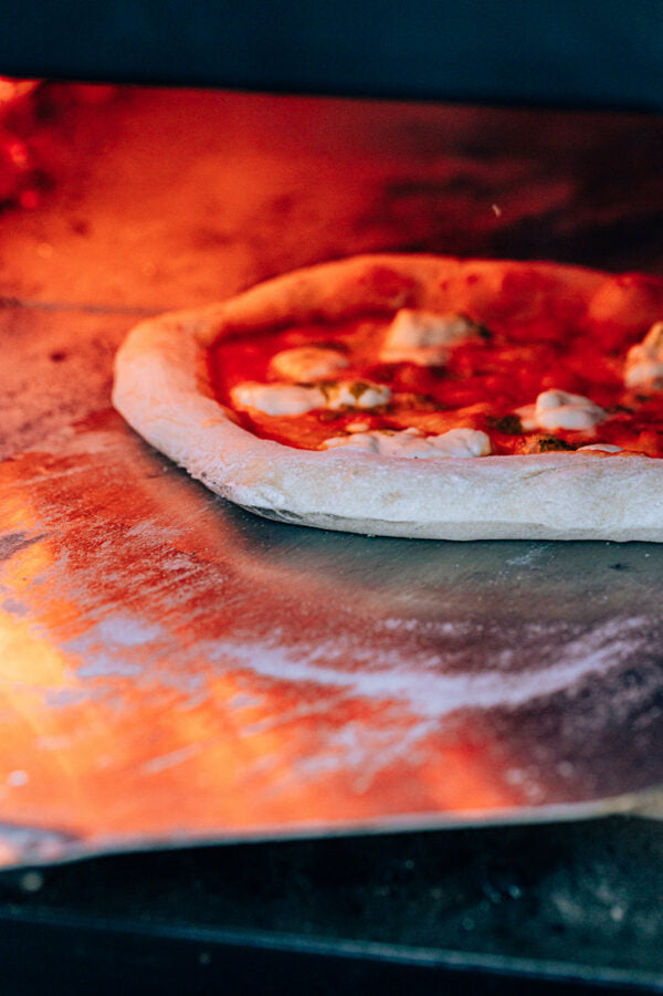 16. Eenmaal de pizza de bakvloer begint te raken, trek je de schep in een snelle beweging uit de oven.