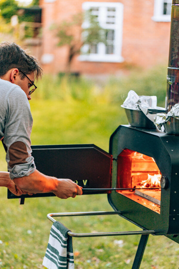 11. Veeg de oven schoon, en leg indien nodig een extra blok hout op het vuur zodat de vlam mooi over het plafond naar de schoorsteen brandt, en zo ook de bovenkant van de pizza gelijkmatig bakt.