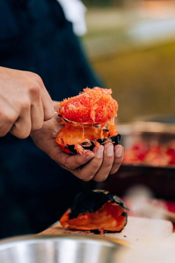 - Na 20 tot 30 minuten haal je de pompelmoes eruit met een handschoen. De pel is mogelijks gedeeltelijk zwart geblakerd, maar dat vormt geen enkel probleem. De geur van de pompelmoes is onweerstaanbaar.